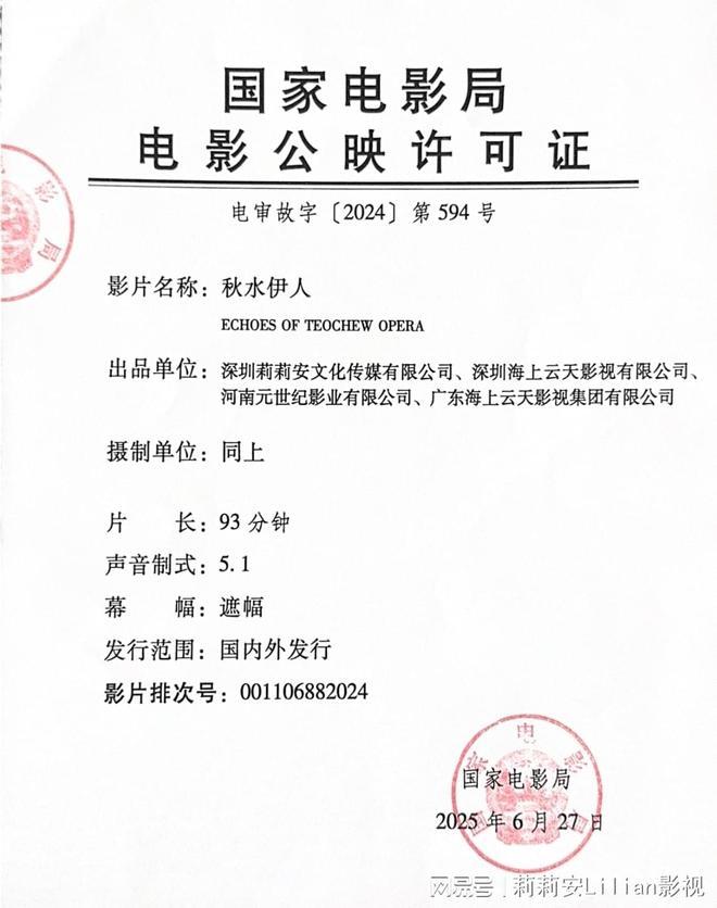 开云真人光影流转,佳音迭传!备受瞩目的潮语电影《秋水伊人》正式取得公映许可证,标志着该片已完成全部审查流程。影片以潮剧艺术传承为主题,融合亲情与传统文化。