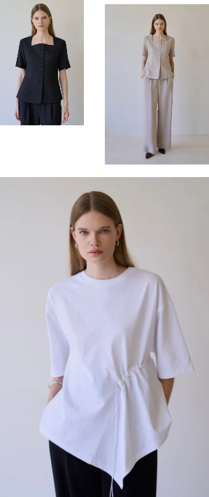 在通勤场景中,ILROZE 的U形衬衫尤为适合:如水般流动的曲线、深侧开衩设计,既能单穿保持干练,又可将前襟塞入裤腰,瞬间切换到会议或午后约会状态。砖红、焦糖等柔暖色调衬衫搭配同色系西装裤,构成整洁统一的视觉效果;而简洁的 T 恤套装,则在周五或休闲日里,通过低调细节传递精致感。
