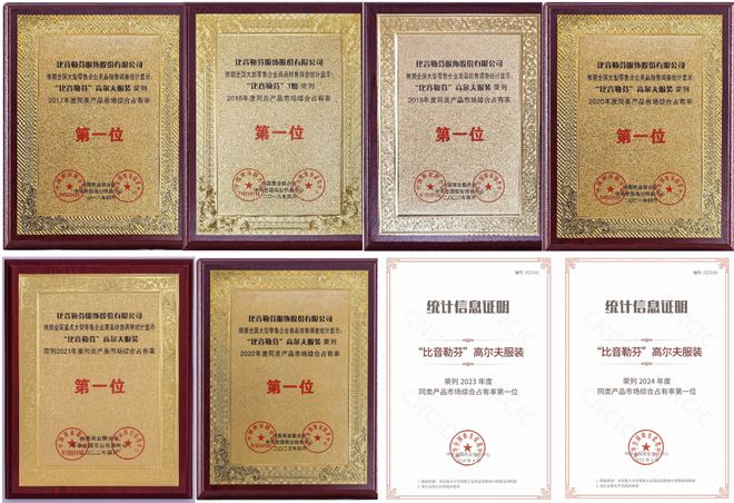 据中国商业联合会、中华全国商业信息中心统计,截至2024年,比音勒芬高尔夫服饰连续八年为“同类产品市场综合占有率第一位”,T恤品类连续七年排名第一位,彰显了比音勒芬在高尔夫服饰领域专业领先的实力地位。